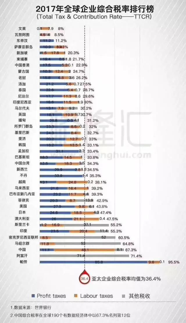 其實在去年年末,世界銀行聯合普華永道會計師事務所發布的《繳稅2017》(Paying Taxes 2017)的專題報告中,對全球190余個經濟體的企業稅收負擔進行了分析。在全球企業總稅率(Total Tax Rate)的排行榜中,中國以68%的稅收負擔排在第12位,比2015年上升一位,遠遠超過世界平均40.6%的總稅率水平。