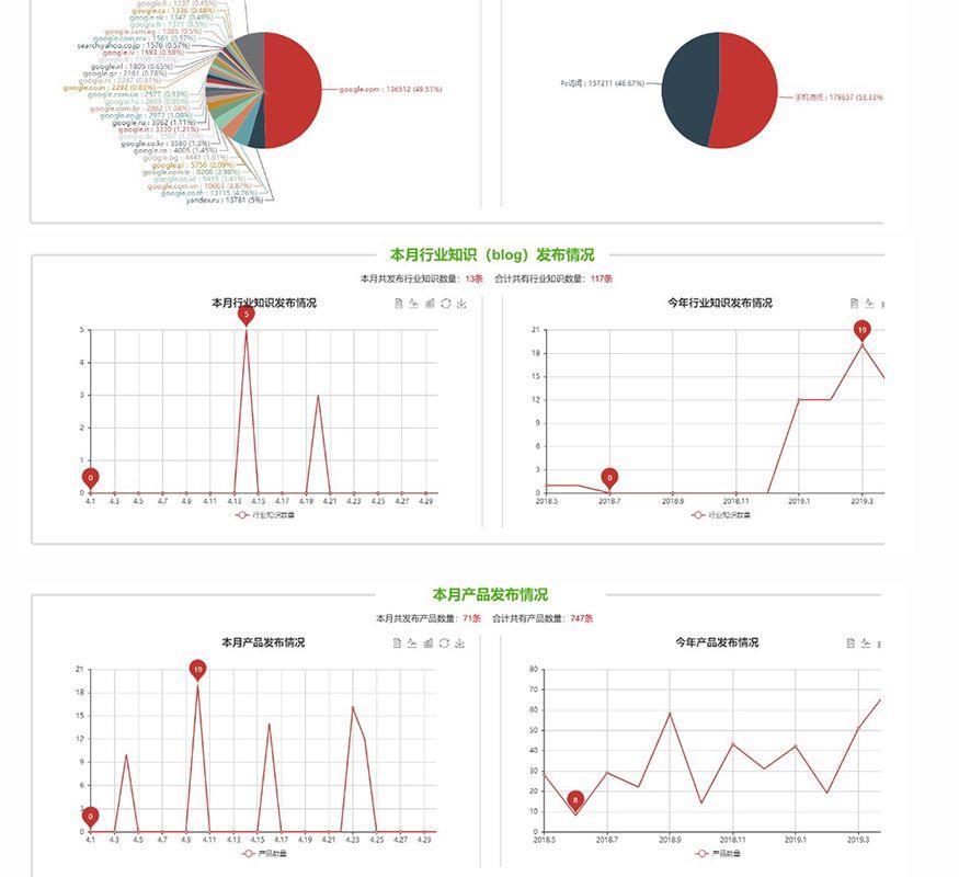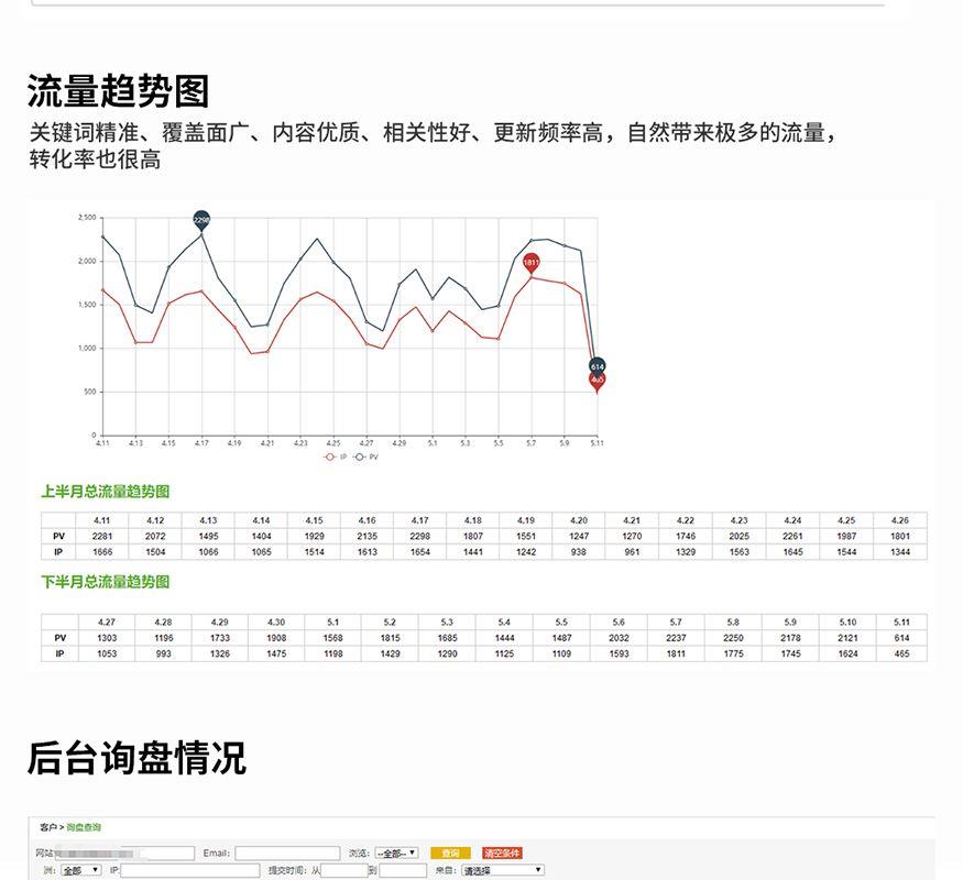 該客戶選擇的是外貿(mào)快車超級版A套餐,目前已合作2年,網(wǎng)站總達(dá)標(biāo)天數(shù)701天。zui新排名在谷歌首頁的關(guān)鍵詞數(shù)量為1204個。客戶很注重網(wǎng)站更新及運(yùn)營情況,4月份,客戶共計更新高質(zhì)量內(nèi)容的產(chǎn)品71個,新聞15條,行業(yè)知識13條,平時基本會維持在每月更新30-40個優(yōu)質(zhì)產(chǎn)品。在這么多高質(zhì)量的頁面帶動下,網(wǎng)站的日均流量可達(dá)到1500個以上,共計帶來1268個詢盤(不包含直接發(fā)郵件至郵箱的詢盤)。
