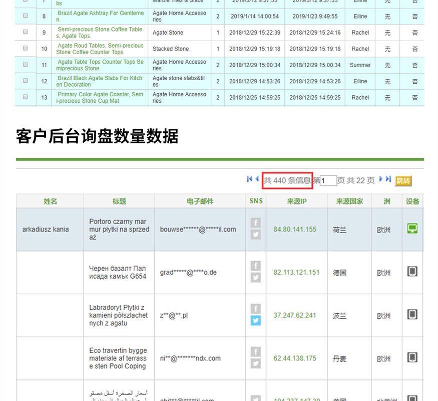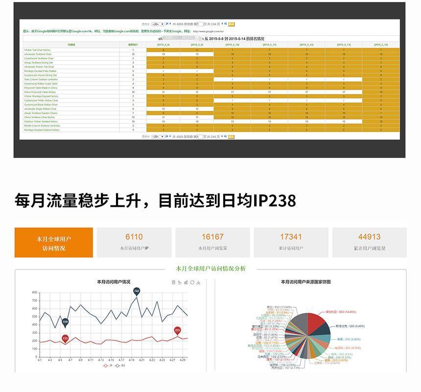 客戶自開通外貿(mào)快車以來,一直注重平臺的運營及維護工作,目前網(wǎng)站已發(fā)布1340個產(chǎn)品,70%以上的產(chǎn)品相似度都保持在75%以下。頁面數(shù)量多、質(zhì)量高,因此被谷歌收錄的頁面數(shù)量也多,進而大大提升了網(wǎng)站的流量。目前網(wǎng)站日均流量高已突破300個,后臺共計收到400多個詢盤(不包含客戶直接發(fā)郵件至郵箱的咨詢)。