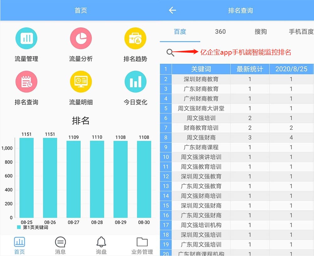 億企寶App:隨時隨地查看和管理關(guān)鍵詞排名、流量、訪問來路、詢盤,與客戶實時溝通互動。