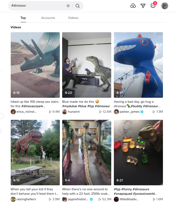 他們還可以讓對特定主題感興趣的人發(fā)現(xiàn)您的內(nèi)容,這些人可能正在搜索特定的短語或標(biāo)簽。例如,如果我想看一些關(guān)于恐龍的視頻(誰不想呢?),我可以只搜索標(biāo)記為#dinosaur 的視頻,然后在剩下的晚上繼續(xù)閱讀三角龍的內(nèi)容。